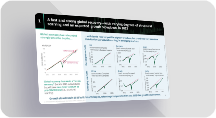 A fast and strong global recovery—with varying degrees of structural 1 scarring and an expected growth slowdown in 2022 Global economy has rebounded …with levels recovery within sight everywhere, but trend recovery has wider strongly since the depths… distribution (structural scarring) in emerging markets 0 2. n o i US Germany Japan s s r World GDP e et Levels recovery: Completed Levels recovery: Expected soon Levels recovery: Expected soon 1 V k 202 r 100 r Trend recovery: Overshoot expected Trend recovery: Not full Trend recovery: Not full e b o Trend recovery a t )22 1)3.50 ) c 1s s 1s 95 m 25 O 1) n21 n n o o560 ed s o i i t i l l a ed l l l d n l i 3.25 i i r r p o 90 p r20 t t u i t 540 l € es l o $ ¥ v i 5 i r 219 1 5 t t el 1 0 3.00 1 ec 0 0 p $85 2 2 2520 s 5 (18 ( ( er Levels recovery P 1 ev e v i 0 17 2.75 500 t 2 80 D u ( ec 2015 2020 2025 2015 2020 2025 2015 2020 2025 x E G 75 C B . ed s China Brazil India v 70 t er es e Levels recovery: Completed Levels recovery: Completed Levels recovery: Expected soon r s 2015 2017 2019 2021 2023 2025 t k h g r i Trend recovery: Completed Trend recovery: Not full Trend recovery: Large impairment r ) l 1 l s A . ) ) n p ma 1 1 200 u s o o s i r l n n l G Global economy has made a “levels o i g g i o2.0 r 180 n l125 i t i l l t n i l e l r i u recovery” (back to 2019 output levels) i t r e s t 160 n g p o B l C r a u M e n but will take more time to return to 1.8 R140 o 100 t R R 5 s 5 0 0 o me / B pre-COVID trend(i.e., structural 1 0 4 120 y E 0 0 0 b 2 2 1 ( ( 0 2 scarring) 75 1.6 2 100 0 ( 2 © 2015 2020 2025 2015 2020 2025 2015 2020 2025 t h g i r y p Growth slowdown in 2022 built into V-shapes, returning many economies to a 2019-like growth environment o 44 C 1. SAAR (Seasonally adjusted annual rate); Source: Oxford Economics, BCG
