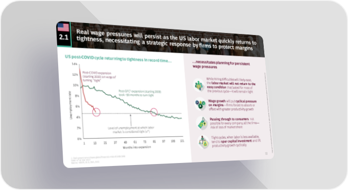 1.8 Real wage pressures will persist as the US labor market quickly returns to 2.1 tightness, necessitating a strategic response by firms to protect margins US post-COVID cycle returning to tightness in record time… …necessitates planning for persistent 14% wage pressures 0 2. n o i s r Post-COVID expansion e 12% (starting 2020) on verge of While hiring difficulties will likely ease, 1 V 202 r e the labor market will not return to the b turning “tight” o t easy condition that lasted for most of c 25 O 10% ed t the previous cycle—it will remain tight a 1 d Post-GFC expansion (starting 2009) p e u t es v took ~90 months to turn tight i a 8% t r ec t p s Wage growth will put cyclical pressure er en P e v i m t y on margins—firms forced to absorb or u ec o 6% x l E p offset with greater productivity growth G C B . ed em v n 4% er es U r s Passing through to consumers not t h g i r l possible for every company, all the time— l A . p 2% u Level of unemployment at which labor o risk of loss of market share r G g market is considered tight (u*) n i t l u s n o C 0% n o Tight cycles, when labor is less available, t s 1 13 25 37 49 61 73 85 97 109 121 o B tend to spur capital investment and lift y b 1 2 Months into expansion 0 productivity growth cyclically 2 © t h g i r y 1. Dark green curve shows global financial crisis of 2008/2009 p o Note: u* at Mar 2017 12 C Source: NBER, BLS, CBO, BCG