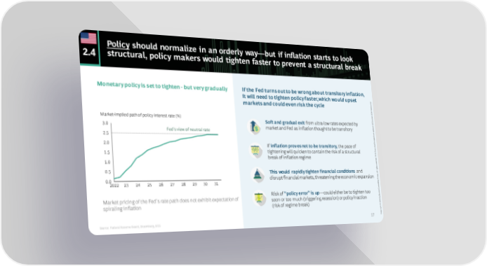 Policy should normalize in an orderly way—but if inflation starts to look 2.4 structural, policy makers would tighten faster to prevent a structural break Monetary policy is set to tighten - but very gradually If the Fed turns out to be wrong about transitory inflation, it will need to tighten policy faster, which would upset 0 2. n o i markets and could even risk the cycle s r e 1 V 202 r e b o t Market-implied path of policy interest rate (%) c 25 O Soft and gradual exit from ultra-low rates expected by ed 3.0 t a market and Fed as inflation thought to be transitory d p Fed's view of neutral rate u es v i 2.5 t ec p s er P 2.0 e v i If inflation proves not to be transitory, the pace of t u ec x 1.5 tightening will quicken to contain the risk of a structural E G C B break of inflation regime . ed 1.0 v er es r s t h g i 0.5 r l This would rapidly tighten financial conditions and l A . p u disrupt financial markets, threatening the economic expansion o 0.0 r G g 2022 23 24 25 26 27 28 29 30 31 n i t l u s n o C n o Risk of “policy error” is up—could either be to tighten too t s o B Market pricing of the Fed’s rate path does not exhibit expectation of soon or too much (triggering recession) or policy inaction y b 1 2 spiraling inflation 0 (risk of regime break) 2 © t h g i r y p o 17 C Source: Federal Reserve Board, Bloomberg, BCG