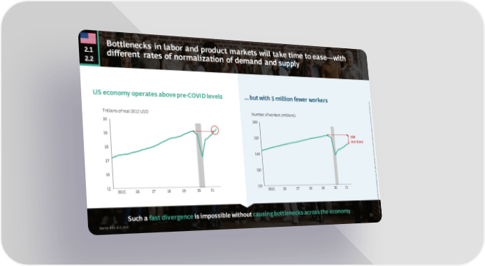 2.1 Bottlenecks in labor and product markets will take time to ease—with 2.2 different rates of normalization of demand and supply US economy operates above pre-COVID levels ... but with 5 million fewer workers 0 2. n o i s r e 1 V 202 r Trillions of real 2012 USD Number of workers (millions) e b o t c 20 160 25 O ed t a d p u es v i 19 5M t ec 150 p s workers er P e v i t 18 u ec x E 140 G C B . ed 17 v er es r s t h g 130 i r l 16 l A . p u o r G g n i t l 15 120 u s n 2015 16 17 18 19 20 21 2015 16 17 18 19 20 21 o C n o t s o B y b 1 2 0 2 © t h g i r Such a fast divergence is impossible without causing bottlenecks across the economy y p o 1010 C Source: BEA, BLS, BCG