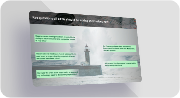 Key questions all CEOs should be asking themselves now Has my market intelligence team invested in its ability to track consumer and competitor moves in real time? Do I have a good view of the return on my investments in offense levers and the benefits they will provide? Have I called a meeting in recent weeks with my core team to ensure that the required defense measures have been taken? Did I ensure the robustness of my organization for upcoming downturns? Did I use the crisis as an opportunity to augment my technology stack to deepen my capabilities?