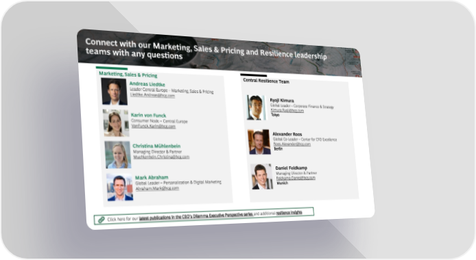 Connect with our Marketing, Sales & Pricing and Resilience leadership teams with any questions Marketing, Sales & Pricing Central Resilience Team Andreas Liedtke Leader Central Europe – Marketing, Sales & Pricing [email protected] Ryoji Kimura Zurich Global Leader – Corporate Finance & Strategy [email protected] Karin von Funck Tokyo Consumer Node–Central Europe [email protected] Munich Alexander Roos Global Co-Leader – Center for CFO Excellence Christina Mühlenbein [email protected] Managing Director & Partner Berlin [email protected] Hamburg Daniel Feldkamp Mark Abraham Managing Director & Partner Global Leader – Personalization & Digital Marketing [email protected] [email protected] Munich Seattle Click here for our latest publications in the CEO's Dilemma Executive Perspective series and additional resilience insights