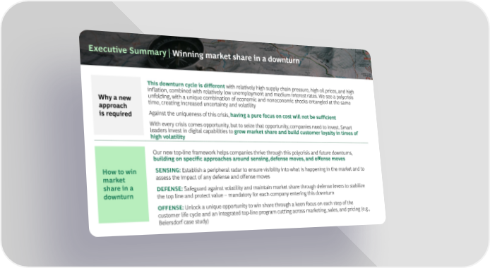 Executive Summary | Winning market share in a downturn This downturn cycle is different with relatively high supply chain pressure, high oil prices, and high inflation, combined with relatively low unemployment and medium interest rates. We see a polycrisis Why a new unfolding, with a unique combination of economic and noneconomic shocks entangled at the same approach time, creating increased uncertainty and volatility is required Against the uniqueness of this crisis, having a pure focus on cost will not be sufficient With every crisis comes opportunity, but to seize that opportunity, companies need to invest. Smart leaders invest in digital capabilities to grow market share and build customer loyalty in times of high volatility Our new top-line framework helps companies thrive through this polycrisis and future downturns, building on specific approaches around sensing, defense moves, and offense moves How to win SENSING: Establish a peripheral radar to ensure visibility into what is happening in the market and to market assess the impact of any defense and offense moves share in a DEFENSE:Safeguard against volatility and maintain market share through defense levers to stabilize downturn the top line and protect value – mandatory for each company entering this downturn OFFENSE:Unlock a unique opportunity to win share through a keen focus on each step of the customer life cycle and an integrated top-line program cutting across marketing, sales, and pricing (e.g., Beiersdorf case study)