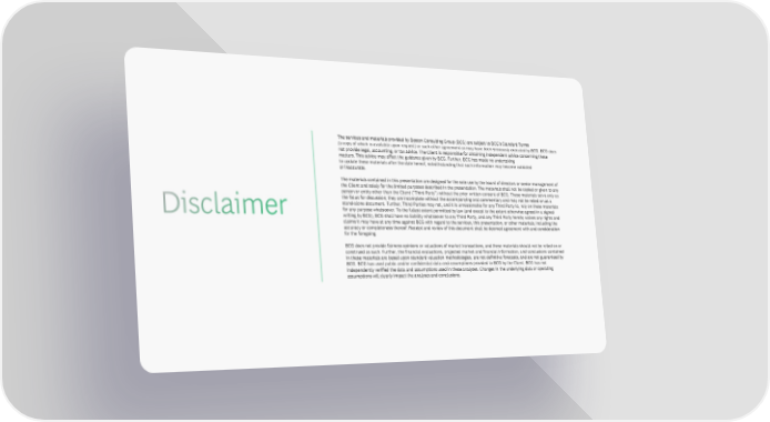 The services and materials provided by Boston Consulting Group (BCG) are subject to BCG's Standard Terms (a copy of which is available upon request) or such other agreement as may have been previously executed by BCG. BCG does not provide legal, accounting, or tax advice. The Client is responsible for obtaining independent advice concerning these matters. This advice may affect the guidance given by BCG. Further, BCG has made no undertaking to update these materials after the date hereof, notwithstanding that such information may become outdated or inaccurate. The materials contained in this presentation are designed for the sole use by the board of directors or senior management of the Client and solely for the limited purposes described in the presentation. The materials shall not be copied or given to any person or entity other than the Client (“Third Party”) without the prior written consent of BCG. These materials serve only as the focus for discussion; they are incomplete without the accompanying oral commentary and may not be relied on as a stand-alone document. Further, Third Parties may not, and it is unreasonable for any Third Party to, rely on these materials for any purpose whatsoever. To the fullest extent permitted by law (and except to the extent otherwise agreed in a signed writing by BCG), BCG shall have no liability whatsoever to any Third Party, and any Third Party hereby waives any rights and claims it may have at any time against BCG with regard to the services, this presentation, or other materials, including the accuracy or completeness thereof. Receipt and review of this document shall be deemed agreement with and consideration for the foregoing. BCG does not provide fairness opinions or valuations of market transactions, and these materials should not be relied on or construed as such. Further, the financial evaluations, projected market and financial information, and conclusions contained in these materials are based upon standard valuation methodologies, are not definitive forecasts, and are not guaranteed by BCG. BCG has used public and/or confidential data and assumptions provided to BCG by the Client. BCG has not independently verified the data and assumptions used in these analyses. Changes in the underlying data or operating assumptions will clearly impact the analyses and conclusions.