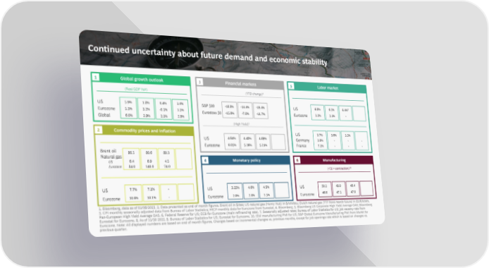 Continued uncertainty about future demand and economic stability 1 Global growth outlook 3 Financial markets 5 Labor market 1 4 7 GDP forecasts (Real GDP YoY) Equity market performance (YTD change) Job openings rate 2021A 2022E 2023E 2024E Oct '22 Nov '22 Dec '22 Q2 '22 Q3 '22 Q4 '22 Change US 5.9% 1.8% 0.4% 1.4% 8 S&P 500 -18.8% -14.4% -19.4% US 6.8% 6.5% 6.4% -0.1ppts Eurozone 5.3% 3.2% -0.1% 1.5% Eurostoxx 50 -15.8% -7.8% -11.7% Eurozone 3.2% 3.1% - -0.1ppts Global 6.0% 2.9% 2.1% 2.9% Unemployment rate9 5 Corporate spreads (High Yield) Oct '22 Nov '22 Dec '22 Change 2 Commodity prices and inflation Oct '22 Nov '22 Dec '22 Change US 3.7% 3.6% 3.5% -0.1ppts Commodity prices2 US 4.64% 4.48% 4.69% +21bps Germany 3.0% - - - Oct '22 Nov '22 Dec '22 Change Eurozone 6.05% 5.26% 5.21% -14bps France 7.1% - - - Brent oil 86.5 80.6 80.3 -0.4% Natural gas 4 Monetary policy 6 Manufacturing US 6.4 6.9 4.5 -35.4% Eurozone 84.0 140.0 74.0 --47.1% Monetary policy rates6 PMI manufacturing (<50 = contraction)10 Consumer price inflation (YoY)3 Oct '22 Nov '22 Dec '22 Change Oct '22 Nov '22 Dec '22 Change Oct '22 Nov '22 Dec '22 Change US 7.7% 7.1% - -0.6ppts US 3.25% 4.0% 4.5% +50bps US 50.2 49.0 48.4 -1.2% Eurozone 10.6% 10.1% - -0.5ppts Eurozone 2.0% 2.0% 2.5% +50bps Eurozone 46.6 47.1 47.8 +1.5% 1. Bloomberg, data as of 01/06/2023. 2. Data presented as end of month figures. Brent oil in $/bbl; US natural gas (Henry Hub) in $/MMbtu; Dutch natural gas (TTF front month future) in EUR/MWh. 3. CPI monthly seasonally adjusted data from Bureau of Labor Statistics; HICP monthly data for Eurozone from Eurostat. 4. Bloomberg. 5. Bloomberg US Corporate High Yield Average OAS; Bloomberg Pan-European High Yield Average OAS. 6. Federal Reserve for US; ECB for Eurozone (main refinancing rate). 7. Seasonally adjusted rates; Bureau of Labor Statistics for US; job vacancy rate from Eurostat for Eurozone. 8. As of 11/30 2022. 9. Bureau of Labor Statistics for US; Eurostat for Eurozone. 10. ISM manufacturing PMI for US; S&P Global Eurozone Manufacturing PMI from Markit for Eurozone. Note: All displayed numbers are based on end of month figures. Changes based on incremental changes vs. previous months, except for Job openings rate which is based on changes vs. previous quarter.