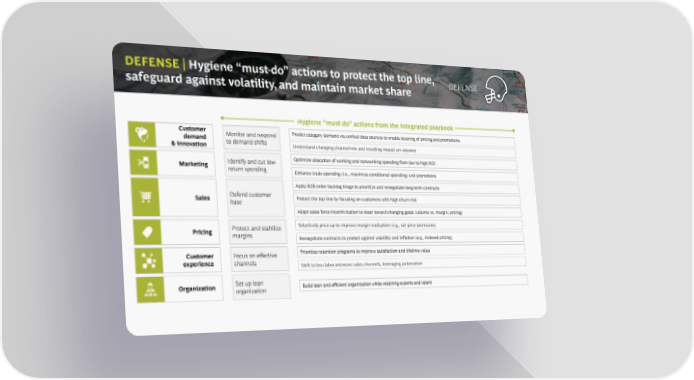 DEFENSE | Hygiene “must-do” actions to protect the top line, DEFENSE safeguard against volatility, and maintain market share Hygiene “must-do” actions from the integrated playbook Customer Monitor and respond Predict category demand via unified data sources to enable steering of pricing and promotions demand to demand shifts & innovation Understand changing channel mix and resulting impact on volumes Identify and cut low- Optimize allocation of working and nonworking spending from low to high ROI Marketing return spending Enhance trade spending (i.e., maximize conditional spending) and promotions Apply B2B order backlog triage to prioritize and renegotiate long-term contracts Sales Defend customer Protect the top line by focusing on customers with high churn risk base Adapt sales force incentivization to steer toward changing goals (volume vs. margin; pricing) Protect and stabilize Selectively price-up to improve margin realization (e.g., set price premiums) Pricing margins Renegotiate contracts to protect against volatility and inflation (e.g., indexed pricing) Customer Focus on effective Prioritize retention programs to improve satisfaction and lifetime value experience channels Shift to less labor-intensive sales channels, leveraging automation Organization Set up lean Build lean and efficient organization while retaining experts and talent organization