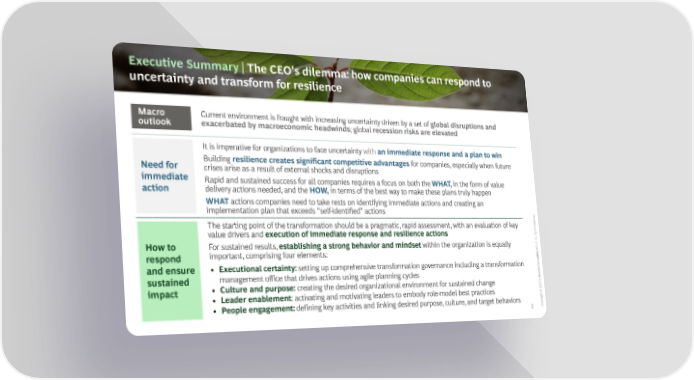 Executive Summary |The CEO's dilemma: how companies can respond to uncertainty and transform for resilience Macro Current environment is fraught with increasing uncertainty driven by a set of global disruptions and outlook exacerbated by macroeconomic headwinds; global recession risks are elevated It is imperative for organizations to face uncertainty with an immediate response and a plan to win Need for Building resilience creates significant competitive advantages for companies, especially when future crises arise as a result of external shocks and disruptions immediate Rapid and sustained success for all companies requires a focus on both the WHAT,in the form of value action delivery actions needed, and the HOW, in terms of the best way to make these plans truly happen WHATactions companies need to take rests on identifying immediate actions and creating an mp m a p a a x “ f- f ” a d. veer The starting point of the transformation should be a pragmatic, rapid assessment, with an evaluation of key esr value drivers and execution of immediate response and resilience actions l ights r How to For sustained results, establishing a strong behavior and mindset within the organization is equally Al. oupr important, comprising four elements: G respond ting sul and ensure • Executional certainty: setting up comprehensive transformation governance including a transformation Con ton sustained management office that drives actions using agile planning cycles Bos by 2 impact • Culture and purpose: creating the desired organizational environment for sustained change 202 • Leader enablement: activating and motivating leaders to embody role-model best practices © • People engagement: defining key activities and linking desired purpose, culture, and target behaviors ight 2 opyrC