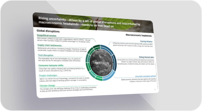Rising uncertainty—driven by a set of global disruptions and exacerbated by macroeconomic headwinds—needs to be met head on Global disruptions Macroeconomic headwinds Geopolitical tension With tension unlikely to ease soon, organizations need to rethink—not just Soaring inflation derisk—their business models for greater advantage in a multipolar world. Inflationary pressure and consumer demand shifts continue to affect global businesses with impacts on labor, energy, and materials costs. Supply chain bottlenecks How will inflation evolve globally and how can leaders blunt its impact Bottlenecks will continue, increasing strategic importance of agile & on their businesses? sustainable supply chains to support strategies and boost advantage. Tech disruption Rising interest rates The inexorable rise of new technologies (e.g., AI, quantum) Central banks are moving carefully and decisively to tamp down will raise the bar for disruptive innovation and reinvention. inflation via higher interest rates with knock-on effects for Uncertainty d. borrowing costs, investment levels, and relative currency values. erve Consumer behavior shifts How will rising interest rates affect capital access for businesses res Consumers are rapidly changing their purchasing behavior as a and consumers, and will rate increases create tectonic shifts in rights competitiveness around the world? lAl result of recent disruptions (e.g., COVID-19). . oupr People challenges G ting Uncertain recession outlook sul Talent is a critical source of advantage; companies focused on people, Con culture, and new ways of working perform stronger in uncertainty. Global economic sentiment has been gloomy, with recession ton indicators mixed and a wide range of forecasts. osB by 2 Climate change What is the economic outlook, how does it differ from previous 202 The climate crisis, the defining challenge of our time, is challenging companies downturns, and how will it play out across sectors? © to step up with ambitious ESG and net-zero strategies and commitments. ight 4 opyrC