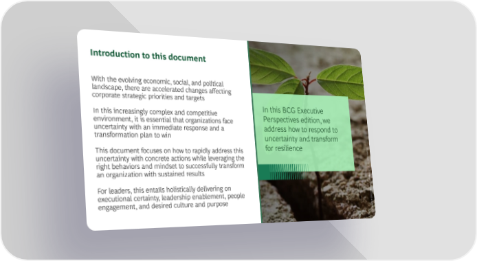 Introduction to this document With the evolving economic, social, and political landscape, there are accelerated changes affecting corporate strategic priorities and targets In this increasingly complex and competitive In this BCG Executive environment, it is essential that organizations face Perspectives edition, we uncertainty with an immediate response and a address how to respond to transformation plan to win uncertainty and transform d. This document focuses on how to rapidly address this for resilience erve uncertainty with concrete actions while leveraging the esr ights l r right behaviors and mindset to successfully transform Al. oupr an organization with sustained results G ting sul on C For leaders, this entails holistically delivering on ton osB executional certainty, leadership enablement, people 2 by 202 engagement, and desired culture and purpose © ight 1 opyrC