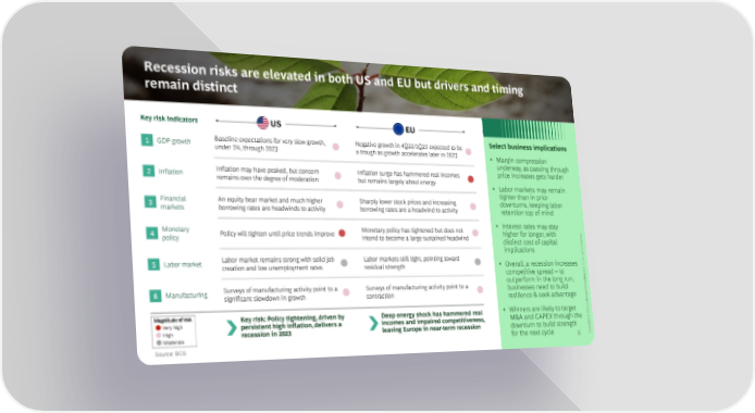 Recession risks are elevated in both US and EU but drivers and timing remain distinct Key risk indicators US EU Baseline expectations for very slow growth, Negative growth in 4Q22/1Q23 expected to be Select business implications 1 GDP growth under 1%, through 2023 a trough as growth accelerates later in 2023 • Margin compression underway, as passing through 2 Inflation Inflation may have peaked, but concern Inflation surge has hammered real incomes price increases gets harder remains over the degree of moderation but remains largely about energy • Labor markets may remain tighter than in prior 3 Financial An equity bear market and much higher Sharply lower stock prices and increasing downturns, keeping labor markets borrowing rates are headwinds to activity borrowing rates are a headwind to activity retention top of mind Monetary Monetary policy has tightened but does not • Interest rates may stay 4 Policy will tighten until price trends improve higher for longer, with d. policy intend to become a large sustained headwind distinct cost of capital erve implications esr Labor market remains strong with solid job Labor markets still tight, pointing toward ights l r 5 Labor market • Overall, a recession increases Al. creation and low unemployment rates residual strength roup competitive spread – to G outperform in the long run, ting Surveys of manufacturing activity point to a Surveys of manufacturing activity point to a sul 6 Manufacturing businesses need to build Con significant slowdown in growth contraction resilience & seek advantage ton osB • Winners are likely to target by 2 Magnitude of risk Key risk: Policy tightening, driven by Deep energy shock has hammered real Very high 202 persistent high inflation, delivers a incomes and impaired competitiveness, M&A and CAPEX through the © High recession in 2023 leaving Europe in near-term recession downturn to build strength ight Moderate opyr for the next cycle 6 C Source: BCG