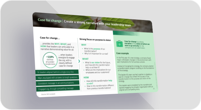 Case for change | Create a strong narrative with your leadership team Case for change… Strong focus on purpose & vision Case for change is a strong narrative of the vision of where we …p v WHY, WHAT,and WHY want to go and why for the HOWthat leaders can articulate in a company and all stakeholders narrative demonstrating value for all • What is the purpose of our transformation? Case example • Why is it important for us now? +110% … a In the first year of a new strategy, a company faced energize & engage WHAT major unforeseen changes in the environment with likelihood the org. with a vast implications for its business outlook. of successful • What is our vision for the future, d. transformation clearly defined erve case for change and how will this transformation Instead of changing the strategy, the company started res help us achieve it? a transformation program building on the foundations l rights • What are the implications for our of the strategy. Al. Sr. leaders aligned behind a single story line employees and our customers? roup G The leadership team worked together to develop a ting Mgrs. equipped with answers to tough questions sul HOW case for change that linked the success of the Con transformation to the purpose and vision of the ton Consistent message in all communications • How will this transformation help strategy. Bos us win? by 2 202 Engaged org. through compelling message • How is this transformation different The leaders were energized by the narrative and © from previous transformations? started engaging the broader organization with an ight aligned and compelling story. 20 opyrC Source: BCG analysis