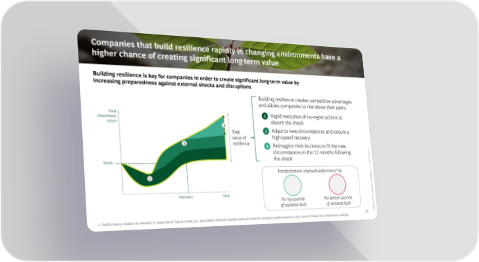 Companies that build resilience rapidly in changing environments have a higher chance of creating significant long-term value Building resilience is key for companies in order to create significant long-term value by increasing preparedness against external shocks and disruptions Building resilience creates competitive advantages and allows companies to rise above their peers: Total Resilient company 1 shareholder • Rapid execution of no-regret actions to return 3 absorb the shock • Adapt to new circumstances and ensure a Total 2 value of high-speed recovery 2 resilience • Reimagine their business to fit the new 3 d. circumstances in the 12 months following veer the shock esr Shock l ights r Industry . Al Transformations improved performance1 by… roup G 1 ting sul +25pp -20pp on C ton osB Recovery Time by For top quartile For bottom quartile 2 202 of resilience built of resilience built © ight 10 opyrC 1. Performance relative to industry in response to future crises, i.e., successful resilient transformations enhance company performance by 25%; Source: Press; BCG Henderson analysis