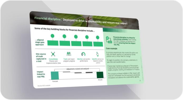 Financial discipline | Deployed to drive accountability and ensure real impact Some of the key building blocks for financial discipline include… Develop G1 Detail G2 Implement G3 Deliver G4 Close G5 Financial discipline is critical for idea financials plan executional certainty, from funding the right initiatives, to tracking, to in …aligned the end ensuring that the impact stage gate Idea Business plan Implementation Implementation Benefits hits P&L approach substantiated approved approved completed realized Case example A company experienced vital market disruption and One source high cost levels, leading to a decreasing market of truth position and a critical need for change. d. veer captured in Consolidate Track and report Monitorand predict Identify and act on To regain its position, the company undertook a 3- res a tool finance and program progress performance issues to course rights implementation data correct year E2E cost transformation. l Al. oupr Finance was involved as a key part of the program, G Adjustments tracked and analyzed implementing financial discipline to ensure ample ting sul Impact targets, progress tracking, and validation of impacts. Con ton linked to Bos real P&L mpa a v +€500m &L mpa , by most of it reinvested into the business to accelerate 2 202 innovation and advance the sustainability agenda. © Forecast Actuals ight 19 opyrC Source: BCG analysis