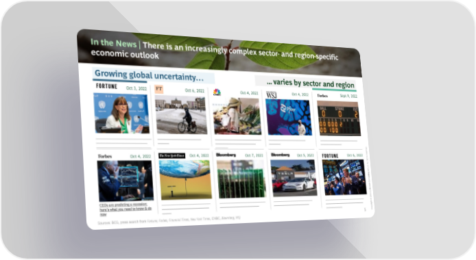 In the News | There is an increasingly complex sector- and region-specific economic outlook Growing global uncertainty… ... varies by sector and region Oct 3, 2022 Oct 6, 2022 Oct 4, 2022 Oct 4, 2022 Sept 9, 2022 'Excessive' policy choices could trigger Central banks face recessionary 'We must change course': UN warns Pharma is place to hide during 3 industries that are poised to do an economic downturn even worse dangers that the world is on the brink of recession well in a recession than 2008 recession, UN agency says recession d. veer Oct 4, 2022 Oct 4, 2022 Oct 7, 2022 Oct 5, 2022 Oct 6, 2022 esr ights l r Al. oupr G ting sul on C ton osB by 2 CEOs are predicting a recession: The first global deflation has begun pma ‘ a a g’ p Tesla's retail fans undeterred by Tech stocks could bounce back by 202 ’ a & and it's unclear just how painful It in demand as recession looms delivery miss, recession fears x a , a ‘v a © now will be ,’ a ight 5 opyrC Sources: BCG, press search from Fortune, Forbes, Financial Times, New York Times, CNBC, Bloomberg, WSJ