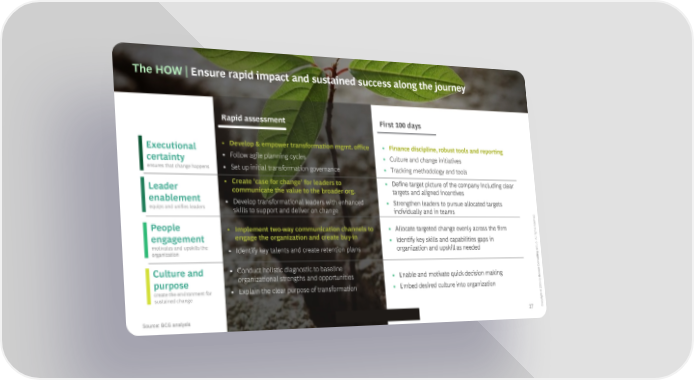 The HOW | Ensure rapid impact and sustained success along the journey Rapid assessment First 100 days Executional • Develop & empower transformation mgmt. office • Finance discipline, robust tools and reporting certainty • Follow agile planning cycles • Culture and change initiatives ensures that change happens • Set up initial transformation governance • Tracking methodology and tools Leader • Create 'case for change' for leaders to • Define target picture of the company including clear communicate the value to the broader org. targets and aligned incentives enablement • Develop transformational leaders with enhanced • Strengthen leaders to pursue allocated targets equips and unifies leaders skills to support and deliver on change individually and in teams d. veer People • Implement two-way communication channels to • Allocate targeted change evenly across the firm esr engagement engage the organization and create buy-in ights l r • Identify key skills and capabilities gaps in .Al motivates and upskills the • Identify key talents and create retention plans organization and upskill as needed roup organization G ting sul Culture and • Conduct holistic diagnostic to baseline on C • Enable and motivate quick decision making ton purpose organizational strengths and opportunities Bos • Embed desired culture into organization by 2 create the environment for • Explain the clear purpose of transformation sustained change 202 © ight 17 opyrC Source: BCG analysis Examples – deep dives available
