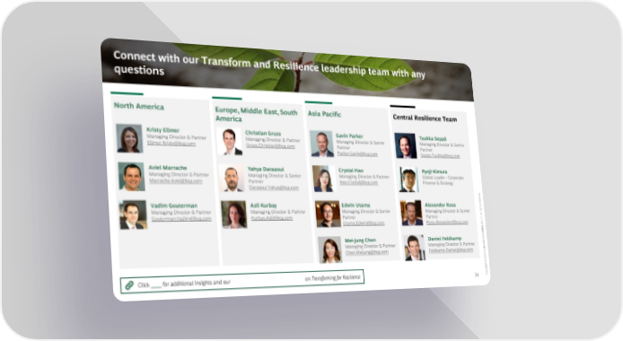 Connect with our Transform and Resilience leadership team with any questions North America Europe, Middle East, South Asia Pacific Central Resilience Team America Kristy Ellmer Christian Gruss Gavin Parker Tuukka Seppä Managing Director & Partner Managing Director & Partner Managing Director & Senior Managing Director & Senior [email protected] [email protected] Partner Partner Boston Copenhagen [email protected] [email protected] Melbourne Helsinki Aviel Marrache Yahya Daraaoui Crystal Hao Ryoji Kimura Managing Director & Partner Managing Director & Senior Managing Director & Partner Global Leader - Corporate [email protected] Partner [email protected] Finance & Strategy New Jersey [email protected] Beijing Tokyo Paris d. veer Vadim Gouterman Asli Kurbay Edwin Utama Alexander Roos esr Managing Director & Partner Managing Director & Partner Managing Director & Senior Managing Director & Senior lights r [email protected] [email protected] Partner Partner Al. Toronto Istanbul [email protected] [email protected] oupr Jakarta Berlin G ting sul Mei-Jung Chen Daniel Feldkamp on C Managing Director & Partner Managing Director & Partner ton [email protected] [email protected] osB Taipei Munich by 2 202 © ight Click here for additional insights and our latest evidence-based publications on Transforming for Resilience 24 Copyr