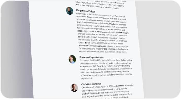 Acknowledgments Javier Perez Moiño Javier is a Managing Director and Partner at Boston Consulting Group and works with leading brands in industries including telecoms, travel, banking and utilities, to support their digital transformation. By helping clients to identify the optimal digital marketing channels mix, and designing and delivering the best personalized experiences in those channels, he helps brands turn outstanding digital experiences into tangible business results. To further secure their digital advantage, Javier works with clients to help them redefine and evolve their organization and operating models. Magdalena Paluch Magdalena is the co-founder and CEO of LabTwin. She is a passionate design-driven entrepreneur with over 14 years of hands-on execution experience in building and leading cross- disciplinary teams in an agile fashion. Magdalena leverages emerging technologies to build products that solve problems for individuals and organizations in a transformative and people-led manner. In her previous role as Director at BCGDV, she was responsible for building up from scratch more than ten corporate-backed startups and innovation initiatives in Europe and the U.S., primarily focused on the healthcare space. Before joining BCGDV, she worked as a Senior Innovation Strategist at Toyota, where she was responsible for identifying and implementing emerging technologies in mobility and robotics such as autonomous vehicle design. Facundo Viguie Aleman Facundo is the Chief Marketing Officer of Omio. Before joining the company in early 2019 he worked in the German start-up ecosystem as SVP Growth for HelloFresh and VP Marketing for Rocket Internet. Originally from Argentina, with a business education background, he started his marketing career in 2008 at MercadoLibre where he led the acquisition marketing department. Christian Henschel Christian co-founded Adjust in 2012, and under his leadership, the company has expanded across the world, reached profitability in under four years, and is today recognized as a major player in the mobile marketing ecosystem. Now counting 500 employees across 16 offices, Christian is heavily involved in shaping the company culture, establishing opportunities for growth, and managing Adjust's development into new territories and technologies. Prior to founding Adjust, Christian worked in Madvertise's management team and headed up the digital revenues department at MTV Networks.