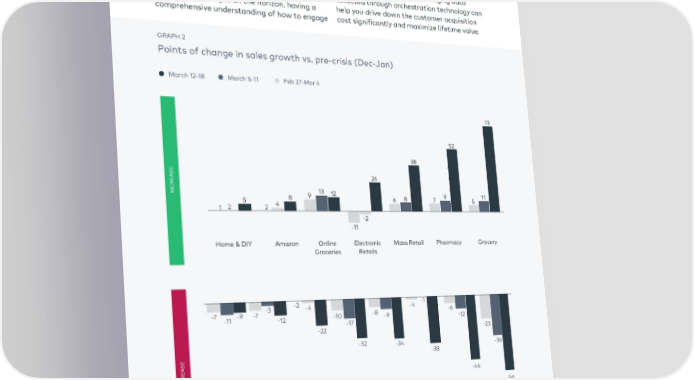 Full-funnel marketing orchestration technology with consumers and buyers as they progress can help gather new data throughout the through the buyer’s journey will now be integral buyer’s journey and help generate insights to success. that can inform activities and priorities. With more digital engagement, every marketer Furthermore, with advertising prices down, needs to invest in the tools to ensure they getting the most out of spend can help reap truly understand their customers; the ability huge rewards. With more inventory available to follow them throughout the funnel has at a cheaper cost, a smart digital advertising always been important, but with behavior strategy based on the fast-changing data having changed, and with new audiences collected through orchestration technology can and further changes on the horizon, having a help you drive down the customer acquisition comprehensive understanding of how to engage cost significantly and maximize lifetime value. GRAPH 2 Points of change in sales growth vs. pre-crisis (Dec-Jan) March 12-18 March 5-11 Feb 27-Mar 4 73 52 38 SE 24 INCREA 9 13 12 9 11 5 8 6 8 7 5 1 2 2 4 -2 -11 Home & DIY Amazon Online Electronic Mass Retail Pharmacy Grocery Groceries Retails -3 -2 -4 -4 -1 -7 -11 -9 -7 -10 -8 -9 -6 -12 -17 -12 -22 -23 -32 -34 -36 SE -38 DECREA -46 -56 Hobby Health, Restaurants Entertain- Dept Transport Apparel Travel Fitness, ment & Stores Beauty Cinemas Source: BCG Research