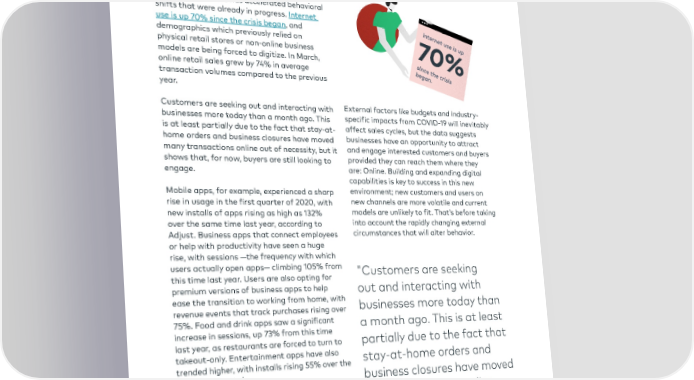 There’s No Returning to ‘Normal’ Radical Digital Shift The COVID-19 crisis has accelerated behavioral shifts that were already in progress. Internet use is up 70% since the crisis began, and demographics which previously relied on physical retail stores or non-online business models are being forced to digitize. In March, online retail sales grew by 74% in average transaction volumes compared to the previous year. Customers are seeking out and interacting with External factors like budgets and industry- businesses more today than a month ago. This specific impacts from COVID-19 will inevitably is at least partially due to the fact that stay-at- affect sales cycles, but the data suggests home orders and business closures have moved businesses have an opportunity to attract many transactions online out of necessity, but it and engage interested customers and buyers shows that, for now, buyers are still looking to provided they can reach them where they engage. are: Online. Building and expanding digital capabilities is key to success in this new Mobile apps, for example, experienced a sharp environment; new customers and users on rise in usage in the first quarter of 2020, with new channels are more volatile and current new installs of apps rising as high as 132% models are unlikely to fit. That’s before taking over the same time last year, according to into account the rapidly changing external Adjust. Business apps that connect employees circumstances that will alter behavior. or help with productivity have seen a huge rise, with sessions —the frequency with which users actually open apps— climbing 105% from "Customers are seeking this time last year. Users are also opting for premium versions of business apps to help out and interacting with ease the transition to working from home, with businesses more today than revenue events that track purchases rising over 75%. Food and drink apps saw a significant a month ago. This is at least increase in sessions, up 73% from this time last year, as restaurants are forced to turn to partially due to the fact that takeout-only. Entertainment apps have also stay-at-home orders and trended higher, with installs rising 55% over the same time period. business closures have moved However, deal creation volume is down, a many transactions online decline that will impact most businesses’ sales out of necessity, but it shows forecasts. Responses to sales outreach have decreased too, suggesting that sales strategies that, for now, buyers are still need to be adjusted to reflect the current looking to engage." buying reality.