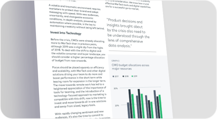 Changing Sentiments Finally eliminating technical debt in your Different demographics are displaying different marketing and tracking tools and building the attitudes to resuming their spending patterns. infrastructure your team needs to scale again is Understanding how to engage different the best way to rebound; reviewing your toolset audiences through digital tools and tailoring and renegotiating with providers is the first communications strategies will be key to step. success. These sentiments are likely to change in ways that are impossible to forecast, and so At BCGDV, we build businesses with scalability deploying tools to monitor behavior and alter as a core consideration. We know how crucial messaging to fit is vital. effective MarTech tools and digital capabilities are for a successful go-to-market. A volatile and traumatic environment requires marketers to protect their brand and adapt messaging with speed. With new audiences, uncertainty, and changeable economic "Product decisions and conditions, in-depth analysis, powered by insights brought about automation where possible, is the key to maintaining creativity without being left behind. by the crisis also need to Invest into Technology be understood through the Before the crisis, CMOs were already allocating lens of comprehensive more to MarTech than in previous years, data analysis." although 2019 saw a slight dip from the highs of 2018. To deal with the shift to digital and the volatile consumer and buyer landscape, you should consider a higher percentage allocation of budget from now onwards. GRAPH 3 CMO budget allocations across Focus should be placed squarely on efficiency major resources and scalability, with MarTech and other digital solutions driving your team to do more and boost performance in the short term while 2017 2018 2019 leaving room for expansion in the longer term. The move towards remote work has led to a heightened appreciation of the importance of 30% tools for teaming, and the introduction of a technology-focused approach to marketing is compatible with this shift; now is the time to invest and move towards all-in-one solutions and away from siloed, legacy tools. 20% With rapidly changing sentiment and new audiences, it’s also the time to commit to making your team fully data literate, leveraging data to fully understand where to invest, where to be more conservative, and where to allocate budget. Product decisions and insights brought about by the crisis also need to be understood through the lens of comprehensive data analysis. Martech Paid Agencies Labor Media