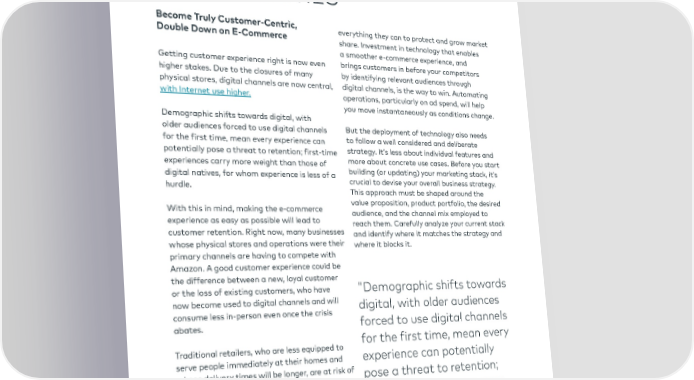 04 LEVERAGE TECHNOLOGY, CAPTURE DIGITAL GROWTH OPPORTUNITIES Become Truly Customer-Centric, everything they can to protect and grow market Double Down on E-Commerce share. Investment in technology that enables a smoother e-commerce experience, and Getting customer experience right is now even brings customers in before your competitors higher stakes. Due to the closures of many by identifying relevant audiences through physical stores, digital channels are now central, digital channels, is the way to win. Automating with Internet use higher. operations, particularly on ad spend, will help you move instantaneously as conditions change. Demographic shifts towards digital, with older audiences forced to use digital channels But the deployment of technology also needs for the first time, mean every experience can to follow a well considered and deliberate potentially pose a threat to retention; first-time strategy. It’s less about individual features and experiences carry more weight than those of more about concrete use cases. Before you start digital natives, for whom experience is less of a building (or updating) your marketing stack, it’s hurdle. crucial to devise your overall business strategy. This approach must be shaped around the With this in mind, making the e-commerce value proposition, product portfolio, the desired experience as easy as possible will lead to audience, and the channel mix employed to reach them. Carefully analyze your current stack customer retention. Right now, many businesses and identify where it matches the strategy and whose physical stores and operations were their where it blocks it. primary channels are having to compete with Amazon. A good customer experience could be the difference between a new, loyal customer or the loss of existing customers, who have "Demographic shifts towards now become used to digital channels and will digital, with older audiences consume less in-person even once the crisis abates. forced to use digital channels Traditional retailers, who are less equipped to for the first time, mean every serve people immediately at their homes and experience can potentially whose delivery times will be longer, are at risk of pose a threat to retention; losing their market share over time. first-time experiences carry Tracking customers throughout the flow to more weight than those of understand potential bottlenecks, testing digital natives, for whom messaging and adapting accordingly, and increased personalization and data enablement experience is less of a hurdle." to identify earlier openings will help you win against competitors, who will also be doing
