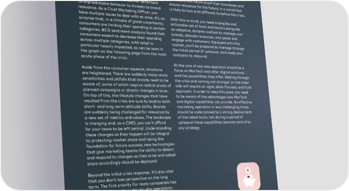 Introduction The COVID-19 crisis has presented a series of closely monitoring customer sentiment, challenges for marketing and sales leaders, marketers can future proof their businesses and from radical changes in consumer sentiment ensure relevance for the future, in a world that to unpredictable behavior to threats to brand is likely to look a lot different to before the crisis. relevance. As a Chief Marketing Officer, you have multiple issues to deal with at once. It’s no With this in mind, you need a tangible and surprise that, in a climate of great uncertainty, actionable set of tools and tactics alongside consumers are limiting their spending in certain an adaptive, dynamic outlook to manage your categories. BCG sentiment analysis found that brands, allocate resources, and speak and consumers expect to decrease their spending engage with customers. Equipped with this across multiple categories, with retail in toolset, you’ll be prepared to manage through particular heavily impacted, as can be seen in the initial period of upheaval, and ready your the graph on the following page from the most company to rebound. acute phase of the crisis. At the core of any new approach should be a Aside from the consumer squeeze, emotions focus on MarTech and other digital solutions are heightened. There are suddenly many more and the possibilities they offer. Getting through sensitivities and pitfalls that brands need to be the crisis and coming out stronger on the other aware of, some of which require radical pivots of side will require an agile, data-focused, and fluid planned campaigns or drastic changes in tone. approach. In order to keep this pace, you need On top of this, the lifestyle changes that have to be aware of the advantages new MarTech resulted from the crisis are sure to lead to both and digital capabilities can provide. An effective short- and long-term attitude shifts. Brands marketing operation in less challenging times are suddenly being challenged for relevance by should be underpinned by a strong deployment a new set of metrics and values. The landscape of the latest tools, but during a period of is changing and, as a CMO, you can’t afford upheaval these capabilities become central to for your team to be left behind. Understanding any strategy. these changes as they happen will be integral to protecting market share and laying the foundation for future success; new technologies that give marketing teams the ability to detect and respond to changes as they arise and adapt plans accordingly should be deployed. Beyond the initial crisis response, it’s also vital that you don’t lose perspective on the long term. The first priority for many companies has been to manage their day-to-day operations and protect revenue, but the crisis is also disrupting business models and altering market landscapes, causing changes that will be felt for years to come. By keeping an open mind to investment and innovation opportunities, reviewing and adapting their offerings, and