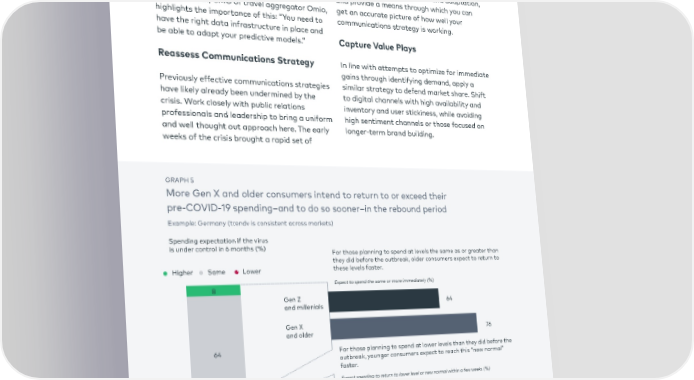 that will help them achieve scalable and cost- communications strategies, with many caught efficient growth. It is crucial to track and unawares and left scrambling for the right analyze in real-time the new emerging customer messaging. As the recovery starts to pick up, journeys and adapt both your product and your staying on top of sentiment and checking in communication strategy to meet current needs. with leaders at regular touch points will put This needs to happen on an agile basis, so it you in a stronger position and decrease the can be adapted again and again as necessary. likelihood of potential pitfalls. Listening tools Data-powered personalization technology can enable real-time response and adaptation, enables businesses to do exactly this. Facundo and provide a means through which you can Viguie Aleman, CMO of travel aggregator Omio, get an accurate picture of how well your highlights the importance of this: “You need to communications strategy is working. have the right data infrastructure in place and be able to adapt your predictive models.” Capture Value Plays Reassess Communications Strategy In line with attempts to optimize for immediate gains through identifying demand, apply a Previously effective communications strategies similar strategy to defend market share. Shift have likely already been undermined by the to digital channels with high availability and crisis. Work closely with public relations inventory and user stickiness, while avoiding professionals and leadership to bring a uniform high sentiment channels or those focused on and well thought out approach here. The early longer-term brand building. weeks of the crisis brought a rapid set of GRAPH 5 More Gen X and older consumers intend to return to or exceed their pre-COVID-19 spending–and to do so sooner–in the rebound period Example: Germany (trendv is consistent across markets) Spending expectation if the virus is under control in 6 months (%) For those planning to spend at levels the same as or greater than they did before the outbreak, older consumers expect to return to Higher Same Lower these levels faster. Expect to spend the same or more immediately (%) 8 Gen Z 64 and millenials Gen X 76 and older 64 For those planning to spend at lower levels than they did before the outbreak, younger consumers expect to reach this “new normal” faster. Expect spending to return to lower level or new normal within a few weeks (%) Gen Z 50 and millenials 28 Gen X 38 and older Source: BCG COVID-19 Consumer Sentiment Survey, March 27-30, 2020 (N=3,085 Germany), unweighted, representative within ±3% of Germany census demographics. Note: Question text: “If the coronavirus were to be under control in 6 months, what do you think your spending habits would be at that point in time?” and “If the coronavirus were to be under control in 6 months when do you think your spending habits would return to ‘normal’ (i.e., similar to before the outbreak)”? Data is similar for respondents who answered the same question with reference to a one-month or three-month time frame.