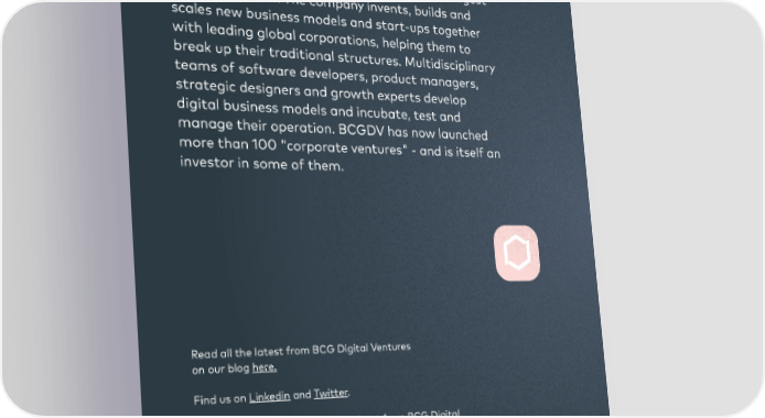 About BCG Digital Ventures BCG Digital Ventures (BCGDV) is the world's largest company builder. The company invents, builds and scales new business models and start-ups together with leading global corporations, helping them to break up their traditional structures. Multidisciplinary teams of software developers, product managers, strategic designers and growth experts develop digital business models and incubate, test and manage their operation. BCGDV has now launched more than 100 "corporate ventures" - and is itself an investor in some of them. Read all the latest from BCG Digital Ventures on our blog here. Find us on Linkedin and Twitter. Check out Buildcast, the new podcast from BCG Digital Ventures. We just released a series of short episodes covering how different sectors are responding to the COVID-19 crisis. You can find it on Spotify, Apple Podcasts and Soundcloud. For inquiries, please contact: digital-imperative@bcgdv.com
