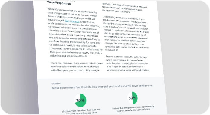 02 REASSESS PRODUCT /MARKET FIT Define or Adjust New approach consisting of frequent, data-informed Value Proposition reassessments will help you adjust to best engage with your customers. While it’s unclear what the world will look like once things start to return to normal, we can Undertaking a comprehensive review of your be sure that consumer and buyer needs will product and how consumers and buyers have have changed. Our research suggests that changed their engagement with it is the first while consumers are resilient to crisis, returning step in dialling in a new conception of product/ to regular behaviors once the acute phase of market fit, updated to fit new needs. It’s a good the crisis is over, “the COVID-19 crisis is less of idea to go back to the core; draw up a list of a point-in-time event than many other crises assumptions about your product’s interaction are, and reminder events and data are likely to with the market and look at how each has continue flooding the news daily for some time changed. It’s time to return to those core to come. As a result, it may take a while for questions: Who is your product for, and why do consumers’ natural resilience to activate and for they need it? their pre-crisis behaviors to return.” This makes adjusting and projecting difficult. Beyond customer needs, the paths through which customers get to the purchasing There are, however, steps you can take to assess point has also changed; physical interaction how immediate and medium-term changes is no longer an option, and the ways in will affect your product, and taking an agile which customers engage with products has GRAPH 6 Most consumers feel that life has changed profoundly and will never be the same. 70% 50% of consumers feel that their lives are believe that things have changed permanently different today than pre-virus and will never be the same as before 100 50 86 83 83 83 70 61 65 64 61 51 0 UK Italy Canada US France UK Italy Canada US France Source: BCG COVID-19 Consumer Sentiment Survey, April 24-27, 2020 - global.