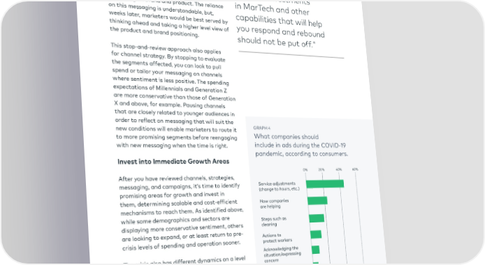 pulled campaigns and scrambled to come up "Right now with new material that was directly relevant understanding customer to the crisis. The result of this was repetition behavior in as much of messaging that served to dilute the communications of each individual brand. detail as possible is As noted by the Wall Street Journal, ‘In these imperative to success, uncertain times…’ became the go-to messaging so smart investments across campaigns, with slight variations in MarTech and other depending on brand and product. The reliance on this messaging is understandable, but, capabilities that will help weeks later, marketers would be best served by you respond and rebound thinking ahead and taking a higher level view of the product and brand positioning. should not be put off." This stop-and-review approach also applies for channel strategy. By stopping to evaluate the segments affected, you can look to pull spend or tailor your messaging on channels where sentiment is less positive. The spending expectations of Millennials and Generation Z are more conservative than those of Generation X and above, for example. Pausing channels that are closely related to younger audiences in order to reflect on messaging that will suit the new conditions will enable marketers to route it GRAPH 4 to more promising segments before reengaging What companies should with new messaging when the time is right. include in ads during the COVID-19 pandemic, according to consumers. Invest into Immediate Growth Areas 0% 20% 40% 60% After you have reviewed channels, strategies, messaging, and campaigns, it’s time to identify Service adjustments promising areas for growth and invest in (change to hours, etc.) them, determining scalable and cost-efficient How companies mechanisms to reach them. As identified above, are helping while some demographics and sectors are Steps such as displaying more conservative sentiment, others cleaning are looking to expand, or at least return to pre- Actions to crisis levels of spending and operation sooner. protect workers Acknowledging the The crisis also has different dynamics on a level situation/expressing of time and geography. Demand contracts concern and expands from category to category Deals and from region to region. By monitoring PSA analytics, marketers can push into promising messages geographies and categories as demand waves peak, increasing spend to generate higher ROI Community efforts margins. Agile marketers will leverage every tool at their disposal and invest in new technologies Source: Morning Consult survey