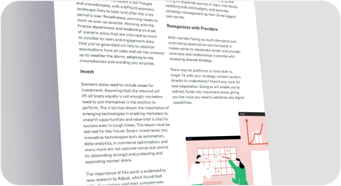 05 PLAN AND INVEST Baseline Scenario Planning, Immediate- and Mid-Term 14 different networks, and listed merging and acting on disparate sources of data, individually The landscape for marketers is still fraught updating bids and budgets, and accurate and unpredictable, with a difficult economic campaign management as their three biggest landscape likely to take hold after the crisis pain points. period is over. Nonetheless, planning needs to start as soon as possible. Working with the Renegotiate with Providers finance department and leadership on a set of scenario plans that are informed as much With markets facing so much disruption and as possible by sales and engagement data costs being squeezed across the board, it that you’ve generated will help to stabilize makes sense to reevaluate vendor and provider assumptions from all sides and set the company contracts and relationships in parallel with up to weather the storm, adapting to the reviewing channel strategy. circumstances and avoiding any surprises. There may be platforms or tools that no Invest longer fit with your strategy; contact vendors directly to understand if there’s any room for Scenario plans need to include scope for cost negotiation. Doing so will enable you to investment. Assuming that the rebound will redirect funds into investment areas, giving lift all boats equally is not enough; marketers you the room you need to establish new digital need to put themselves in the position to capabilities. perform. The crisis has shown the importance of emerging technologies in enabling marketers to unearth opportunities and value that is vital for success even in tough times. This lesson must be learned for the future: Smart investments into innovative technologies such as automation, data analytics, e-commerce optimization, and many more are not optional extras but central to rebounding strongly and protecting and expanding market share. The importance of this point is evidenced by new research by Adjust, which found that 81% of marketers said their company was planning to increase its marketing or advertising automation budget in 2020. The study also highlighted the complexity of campaigns and marketers’ difficulty managing them: Marketers were found to handle an average of 19 advertising campaigns across approximately