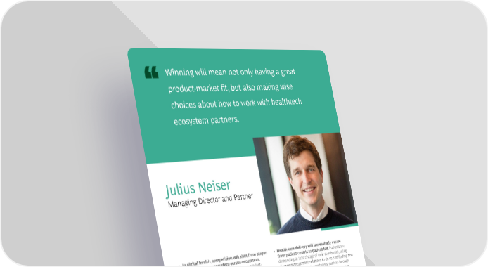 Winning will mean not only having a great product-market fit, but also making wise choices about how to work with healthtech ecosystem partners. Julius Neiser Managing Director and Partner • In digital health, competition will shift from player- • Health care delivery will increasingly evolve versus-player to ecosystem-versus-ecosystem. from patient-centric to patient-led. Patients are Winning will mean not only having a great product- demanding to take charge of their own health, using market fit, but also making wise choices about how to disease management solutions to do so and finding new work with healthtech ecosystem partners. Such partners ways to connect to their care teams, such as through include data ecosystems, infrastructure and cloud ever-more-advanced remote diagnostic, delivery, and ecosystems, and device ecosystems, as well as networks monitoring solutions. This new wave of patient-led care of providers, payers, and health systems. will require great leaps in integrating people, services, software, and hardware. • The focus of digital-health investments will fundamentally change from top-line growth to profitability. Digital-health solutions have proliferated, with investors making big bets to capture a share of the booming healthtech sector. In the coming year, many of these solutions will fail if they have not sufficiently reduced business-model risks and demonstrated a path to profitability. On the flip side, investors will double down on solutions that satisfy these requirements, as health care in general—and healthtech in particular—is recession resistant.