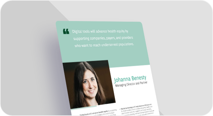 Digital tools will advance health equity by supporting companies, payers, and providers who want to reach underserved populations. Johanna Benesty Managing Director and Partner • Digital tools will advance health equity by supporting • Digital technology will help improve clinical care companies, payers, and providers who want to reach by enabling data-driven analysis and giving health care underserved populations. Examples include tools that practitioners tools that support continuous learning, enable better decisions, permit the measurement of best-practice sharing, and operational research based on impact, allow more personalized treatment pathways, real-world evidence. For example, networks of intensive correct biases in data collection, or alleviate geographic care units (ICUs) may use federated learning—a barriers through the use of hybrid care models that machine-learning technique that multiple entities can use provide access to specialized services. to build a common model without sharing their data—to identify best practices in patient management and create a score for each ICU on the basis of its compliance with those practices and its alerts for high-risk cases.