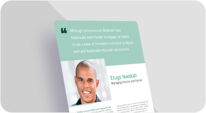 Although consumers on Medicaid have historically been harder to engage, we expect to see a wave of innovation prompted by digital- tech and localization-focused new entrants. Etugo Nwokah Managing Director and Partner • Medical- and prescription-cost transparency will tainable growth in premiums (which were about $13,700 be a renewed focus for payers, providers, employers, per employee in 2022). Consumers will increasingly use governments, and consumers. The catalyst is the Center financial services such as “buy now, pay later” to finance for Medicare and Medicaid Services’ Transparency in their medical needs. And this trend may shape how Coverage Rule (CMS-9915-F), which went into effect on industry players enter new markets and engage with July 1, 2022. The dynamics involved—including the MLR existing ones. credit, the financial mechanism that will allow payers to provide incentives to consumers to shop for health • Medicaid is the next frontier for health care care services—are complex. On the prescription side, innovation. Over the past decade, Medicare has been companies such as GoodRx, Mark Cuban Cost Plus Drug the primary focus of innovation, much of it in the health Company, and Amazon are using scale and operational care payer and services space. Medicaid and Medicare efficiency to find pockets of drugs that they can source, face similar cost pressures, especially within the macro administer, and deliver at low cost to consumers. environment, and this has implications at both state and federal levels. Although consumers on Medicaid have • Ongoing advancement in technologies such as AI historically been harder to engage, we expect to see a and ML, blockchain, and workflow automation will wave of innovation prompted by digital-tech and create more opportunities to address the out-of- localization-focused new entrants. Such innovation will pocket spending that US consumers require must touch on social determinants of health but also, more provide health care. Health care costs account for 10% to comprehensively, on individuals across topics such as 20% of a typical US consumer’s wallet—and 20% of total nutrition, mental health, and sleep. US GDP spending—and US employers are seeing unsus-