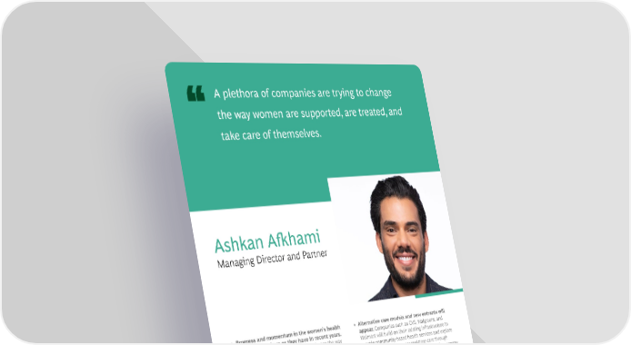 A plethora of companies are trying to change the way women are supported, are treated, and take care of themselves. Ashkan Afkhami Managing Director and Partner • Progress and momentum in the women’s health • Alternative care models and new entrants will space will continue as they have in recent years. appear. Companies such as CVS, Walgreens, and A plethora of companies are trying to change the way Walmart will build on their existing infrastructure to women are supported, are treated, and take care of provide community-based health services and explore themselves. We are especially excited to see positive channels for providing near-real-time care through trends in fertility options (such as those offered by innovative new technologies and services. Other compa- Ovia Health and Progyny), community-based care nies, such as Amazon (following its recent acquisition of (Cayabacre), support for underserved populations One Medical), will leverage their strategic assets to move (Sesh Groups), care advocacy (Maven), alternative birth into holistic health care, including work that focuses on options (Oula Health), and mental health services that sleep, activity, and nutrition. are uniquely designed for women (Caraway Health). In addition, both large companies and startups will make • The need for outcome-based solutions backed strong pushes for women’s health equity in different by real-world evidence and studies will pose a countries around the world in order to provide better stronger barrier to entry into digital health. Over experiences and options. We look forward to additional the past decade, we have seen various organizations— attention, investment, and innovation in the women’s such as Omada, Proteus Digital Health, WellDoc, health space in 2023. Akili Interactive, and Pear Therapeutics—take digital solutions to market, with mixed outcomes. As a result, although CPT/ICD (procedural and diagnostic) codes are available for remote patient monitoring and other clinical services, manufacturers within the pharmaceu- tical and medical-device sectors, along with payers and providers, will require more evidence before they adopt or reimburse such digital health solutions.